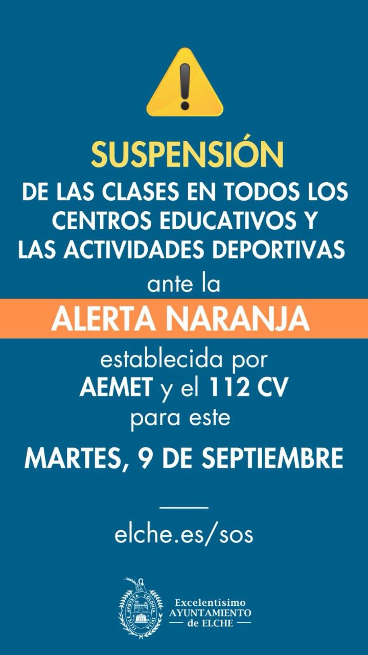 Ante la alerta naranja por lluvias y tormentas emitida por AEMET, el CECOPAL ha decidido suspender toda la actividad docente el martes 9 de septiembre en todos los centros educativos del municipio (infantil, primaria, secundaria y FP), tanto públicos, privados como concertados, así como las actividades extraescolares al aire libre.