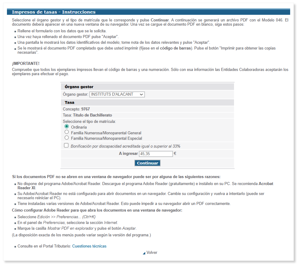 → Paso 1: Pulsar Imprimir para obtener un documento pdf con las 3 copias del modelo 046 e imprimir las 3 copias (las 3 copias de la tasa hay que imprimirlas obligatoriamente tanto para el pago presencial en la entidad bancaria como para el pago telemático).