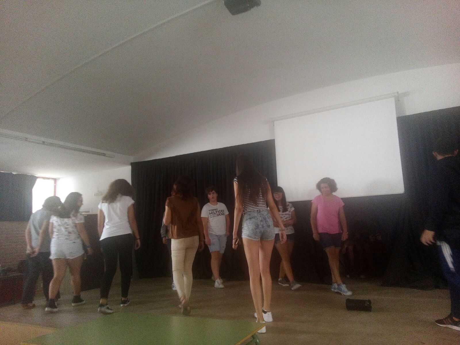 Las fotos muestran a las profesoras de Valenciano, Maribel Sánchez i Maria Josep Pérez, días antes, ensayándola en el salón de actas de nuestro instituto con alumnos de 1.º y de 4.º de ESO.