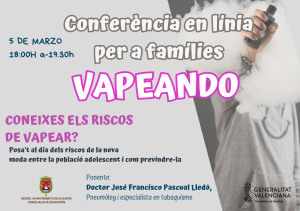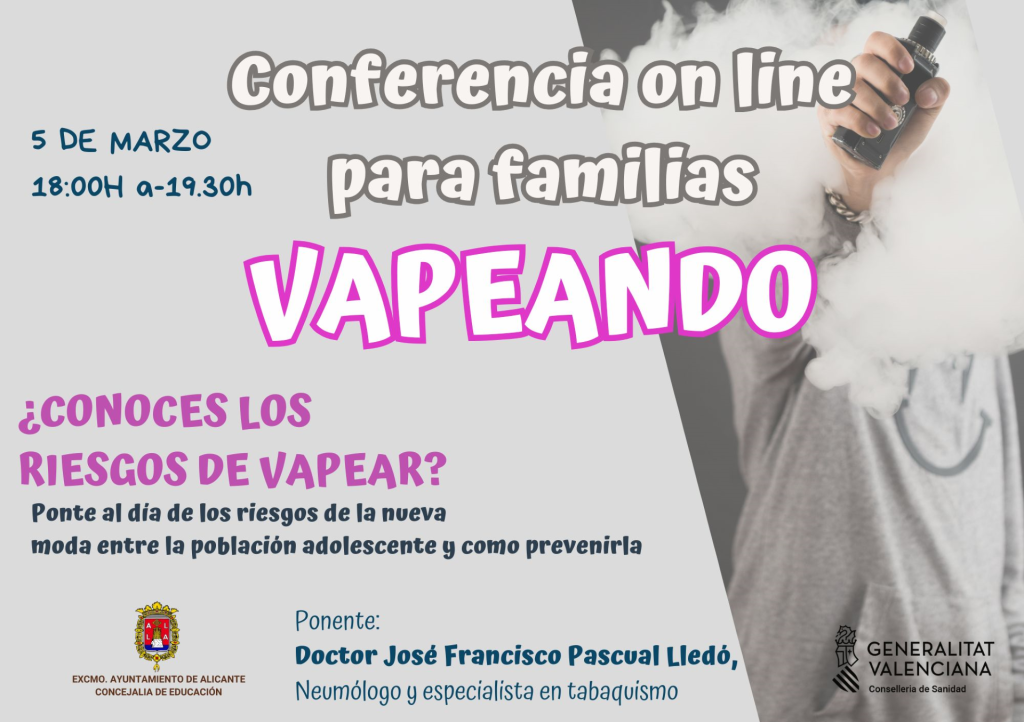 Per a parlar sobretot això, des de la Regidoria d’Educació de l’Ajuntament d’Alacant, hem organitzat dimecres que ve 5 de març, la SEMINARI WEB «VAPEANDO«, que serà a càrrec del doctor Francisco Pascual Lledó, pneumòleg i especialista en tabaquisme.