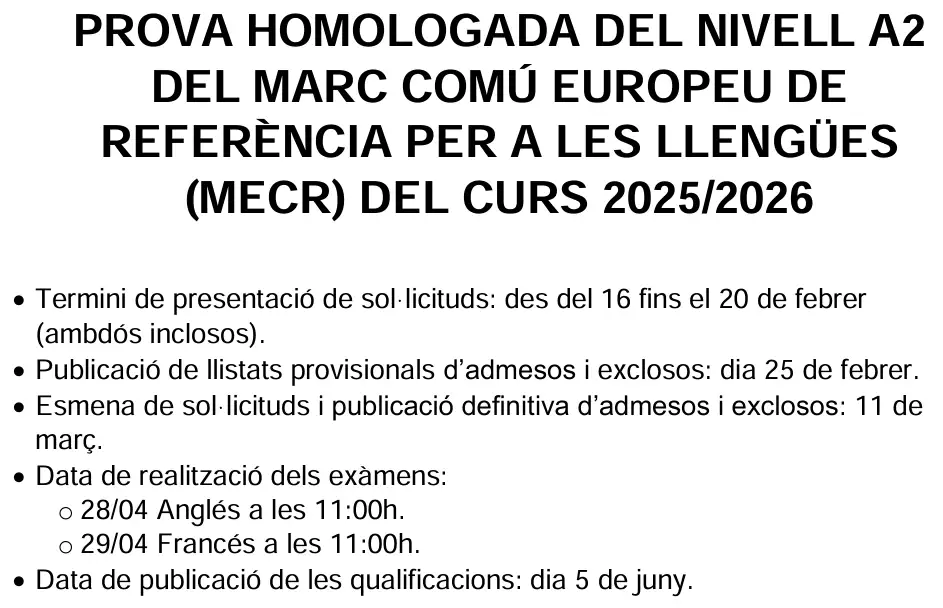 S’ha publicat la convocatòria de les proves homologades del nivell A2 del Marc Europeu Comú de Referència per a les Llengües (MECR) per al curs 2025/2026. És una prova voluntària que permet obtindre el certificat A2 i acreditar la competència lingüística de l’idioma estranger.
