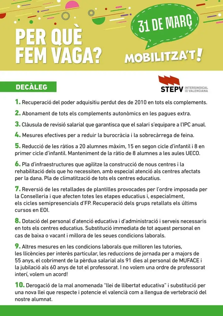 Exigiendo a la Consellería de Educación comenzar una negociación en el marco de la mesas de negociación para la revisión de los salarios del conjunto del profesorado valenciano, que ha visto como año tras año ha ido perdiendo poder adquisitivo, por la recuperación de las plantillas según el Acuerdo firmado por todos los sindicatos de la Mesa Sectorial con el Botánico, por la bajada de las ratios que garantice una inclusión real del alumnado con necesidades y la calidad educativa, por unas infraestructuras dignas y seguras para todo el mundo, por la reducción de la burocracia y por la potenciación del valenciano en la escuela, más necesario que nunca después de la publicación de la Ley de Libertad Educativa.