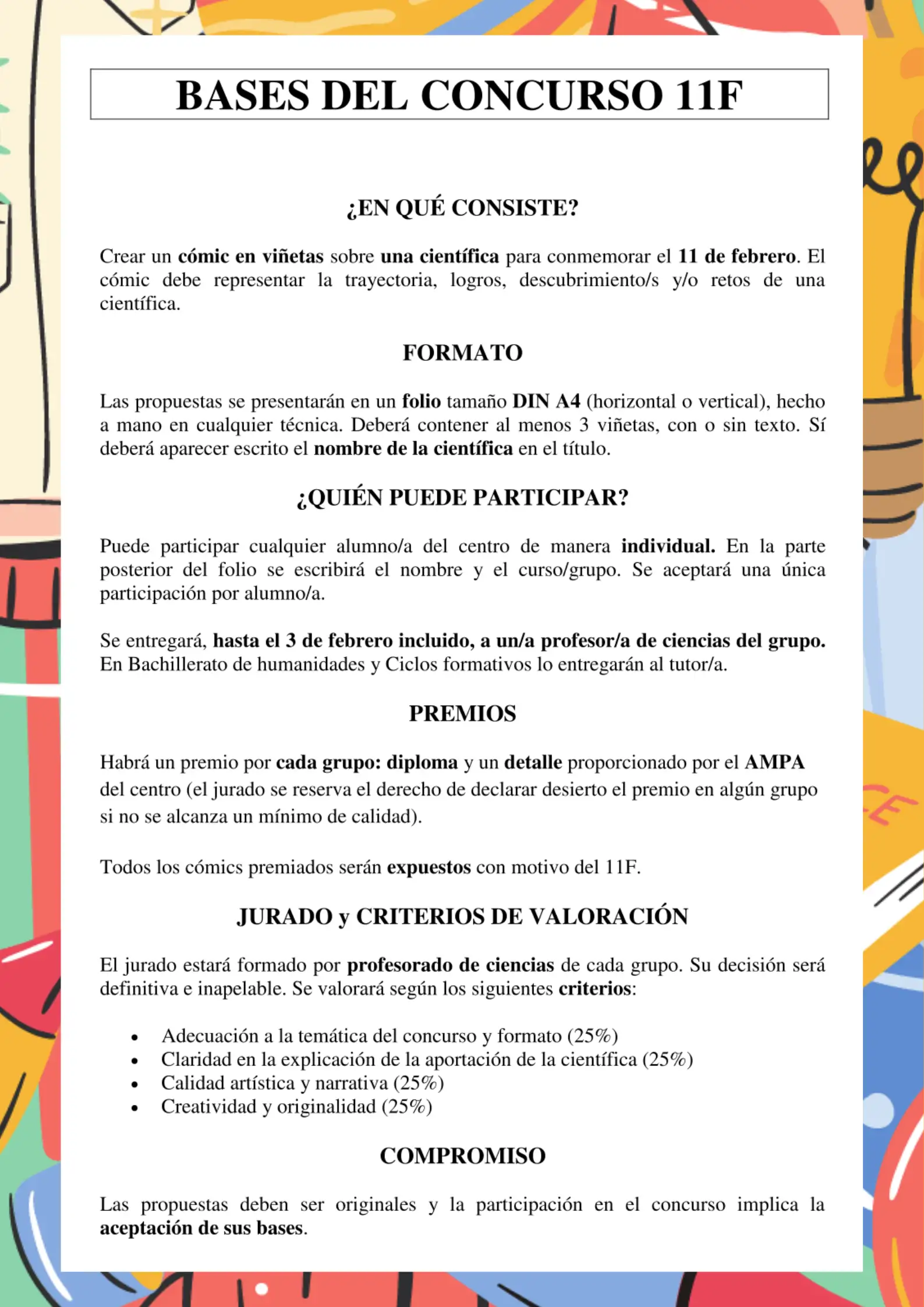 Este año el concurso tendrá una dinámica diferente. Consistirá en la creación de un cómic en viñetas en tamaño A4, elaborado de manera manual con cualquier técnica, que represente la trayectoria, logros, descubrimientos o retos de una científica.