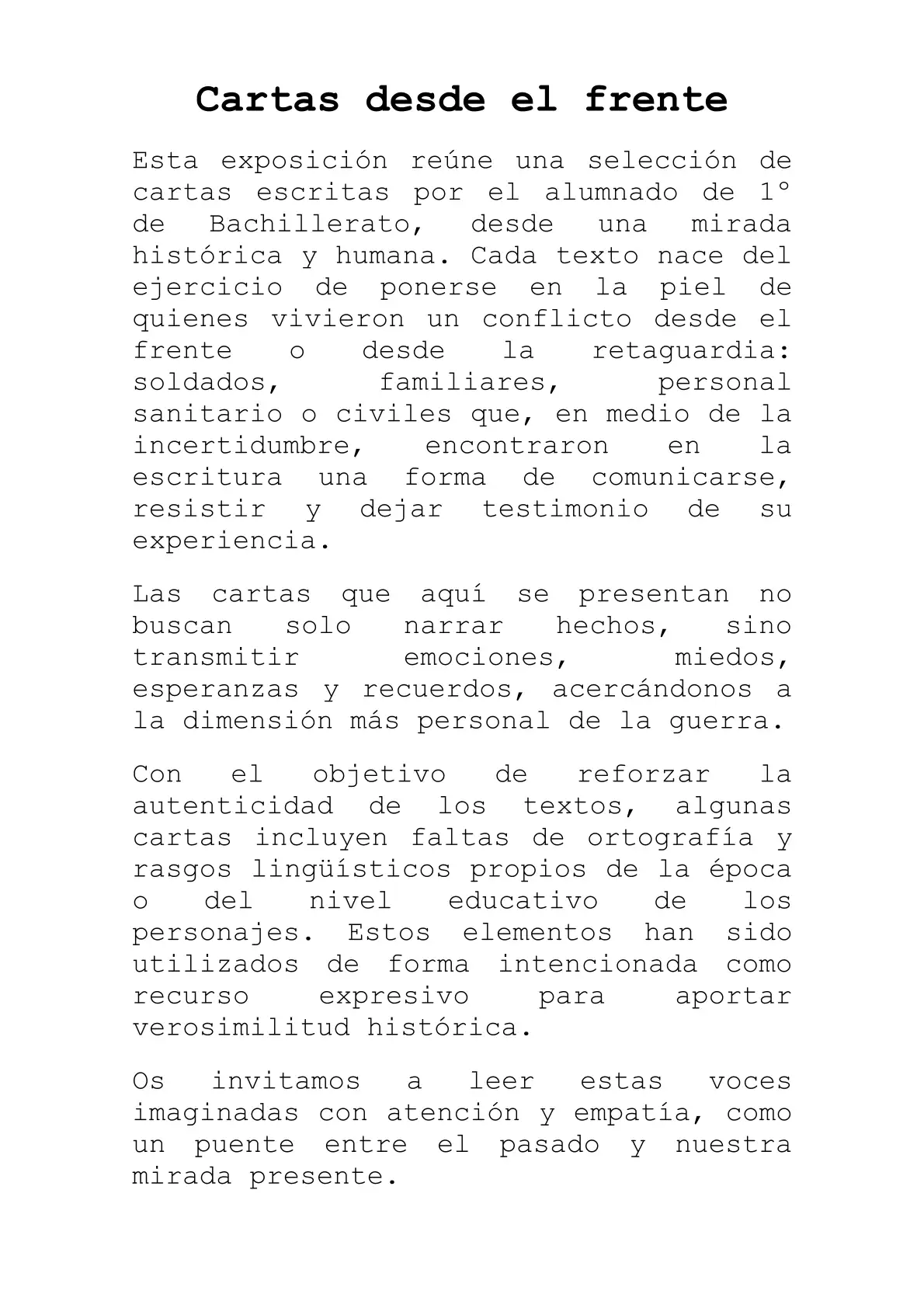 El alumnado de 1º de Bachillerato, desde la materia Historia del Mundo Contemporáneo, ha creado una exposición de cartas ficticias inspiradas en testimonios de guerra.