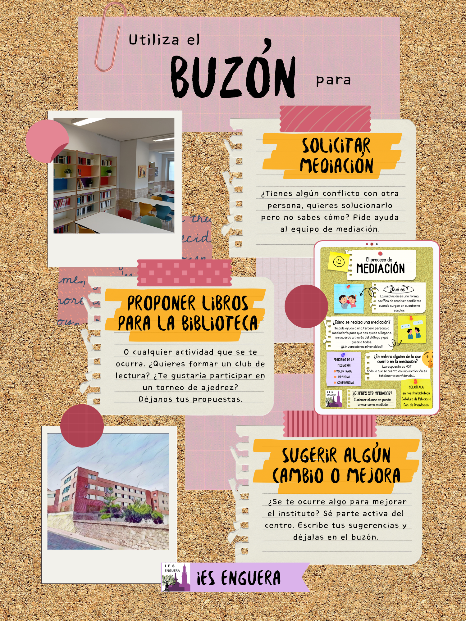 La biblioteca de la IES Enguera inició su renovación en el curso 2022-2023 cuando se creó la Comisión de Biblioteca. Este grupo está formado por un conjunto de profesoras de diferentes departamentos que colabora en varias tareas relacionadas con las necesidades de la biblioteca.