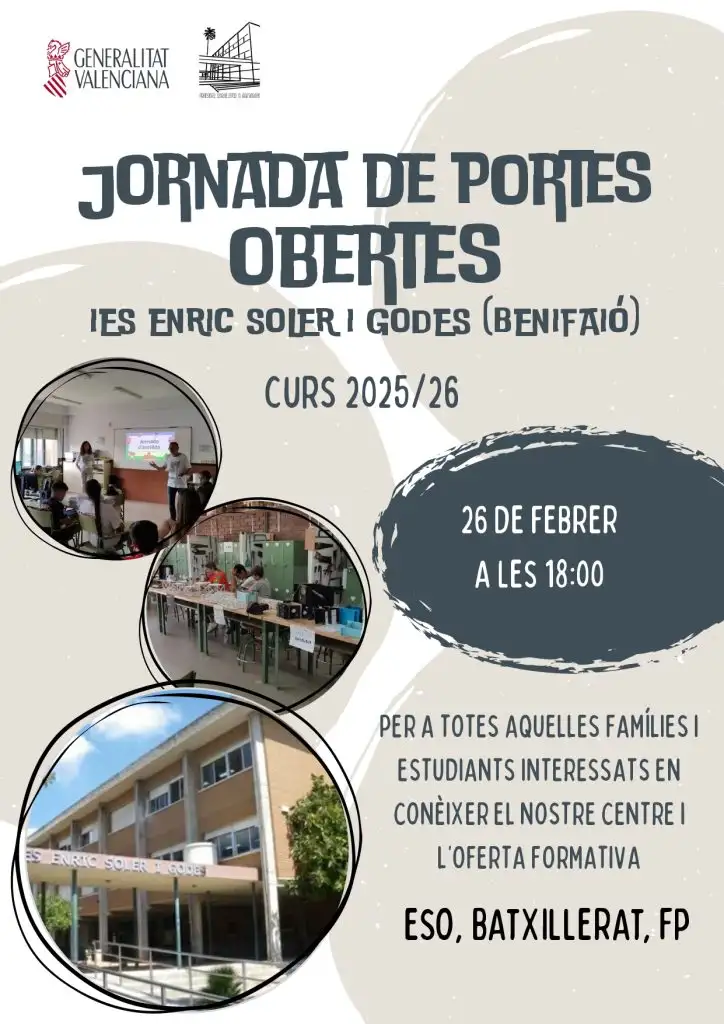 El proper dijous, 26 de febrer, a les 18:00 h. de la vesprada, tindrem portes obertes al centre per a donar a conéixer la nostra oferta educativa. Vos esperem!