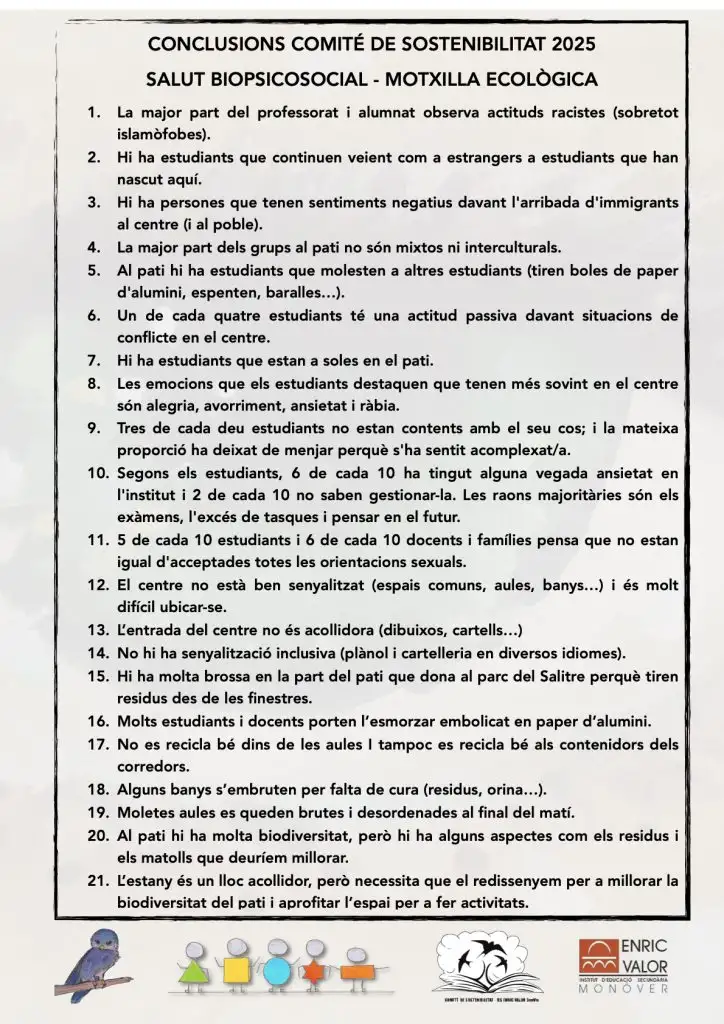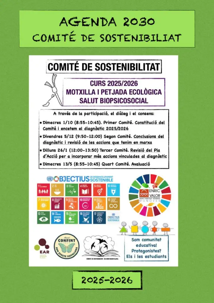 Per tant, el comitè ens aporta un coneixement de la realitat del centre sobre les nostres pràctiques quotidianes, que tenen impacte en el medi ambient i en el benestar general. D’aquesta manera, cada trimestre hi ha un comitè i a final de curs un altre amb eco delegats d’altres centres, d’aquesta manera es creen noves propostes.