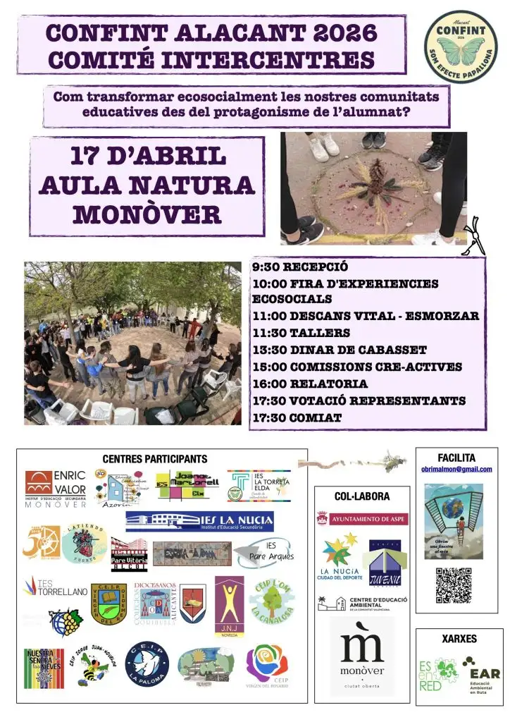 El divendres 17 d’abril se celebrarà la segona CONFINT de la província d’Alacant a l’Aula de Natura de Monòver. Participaran 20 centres de primària i secundària de la provincia. El lema de la conferència de joves tornar a ser ‘Som Efecte Papallona’. Ecodelegades i ecodelegats compartiran experiències ecosocials transformadores que han protagonitzat en les seues comunitats educatives. En aquesta conferència es potenciarà el diàleg i apoderament de l’alumnat. Perquè davant la situació d’emergència planetària actual, les i els joves ens diuen… Sino és ara, quan? Si no som nosaltres/as Qui?
