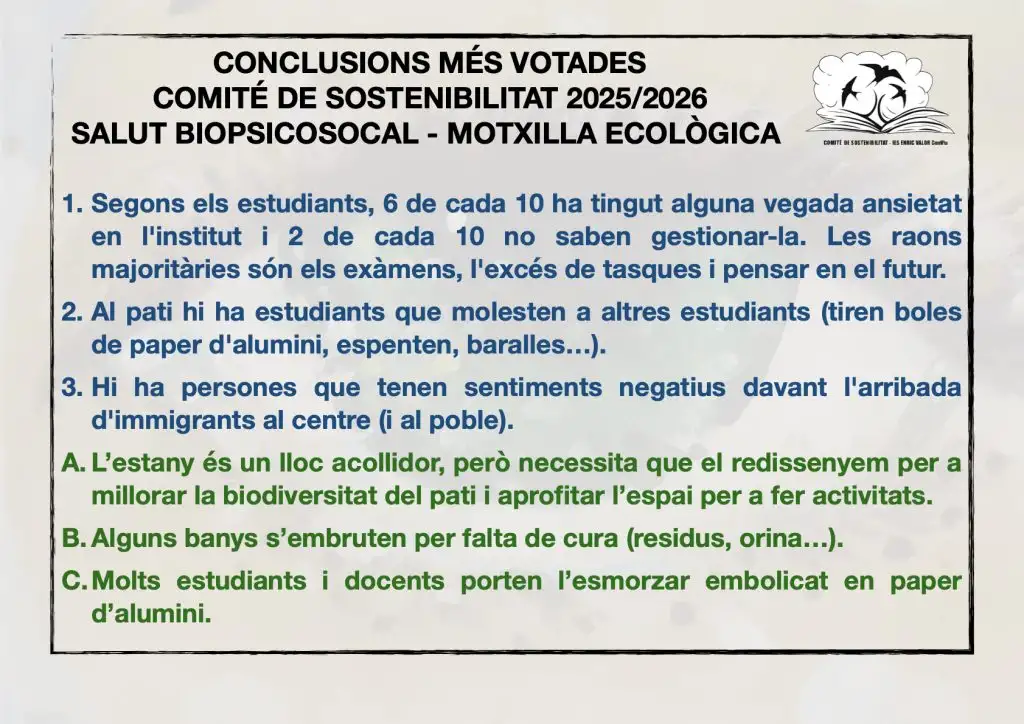 De fet, l’1 d’octubre va tindre lloc el primer Comité de Sostenibilitat d’aquest curs. Hi ha accions que continuen al centre, com la transformació d’espais, Societat Ansietat 0 i Biblioteques Humanes Interculturals i Biodiverses. Aprofitarem el diagnòstic per revisar la transformació encetada i obrir noves temàtiques vinculades a les temàtiques del Comité, salut biopsicosocial i motxilla ecològica. A més el diagnòstic servirà per a començar altra aventura, transformar ecosocialment des de l’art, ja que som centre PLANEA.