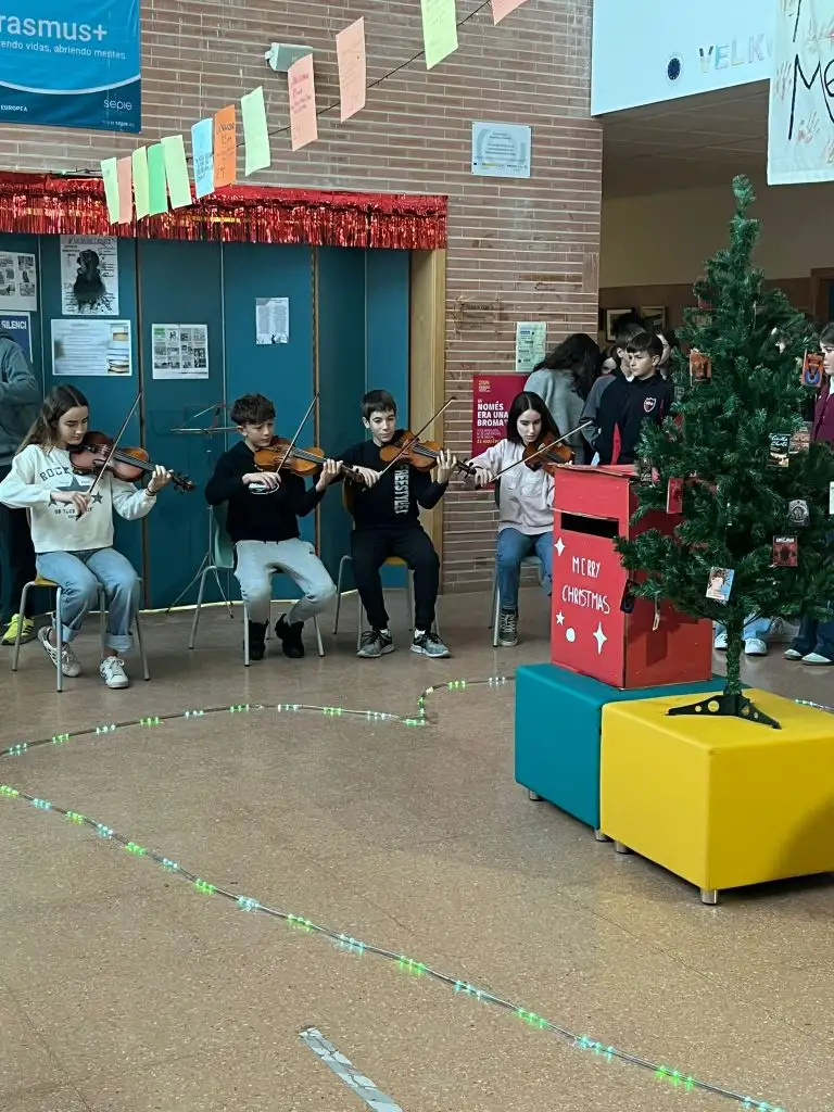 En aquest escenari hem celebrat un acte literari organitzat per Foment Lector, on els nostres estudiants han llegit cites d’escriptors i escriptores sobre el Nadal, acompanyats per la dolça música dels violins.