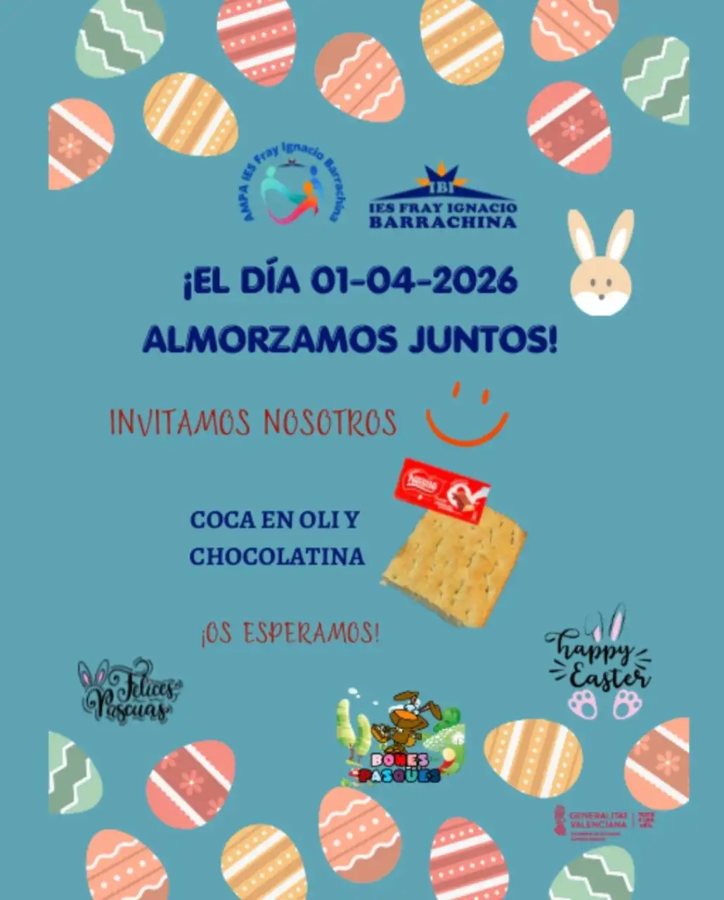 🥪 Esmorzar: serà oferit per l’AMPA, en col·laboració amb l’IES Fra Ignacio Barrachina.