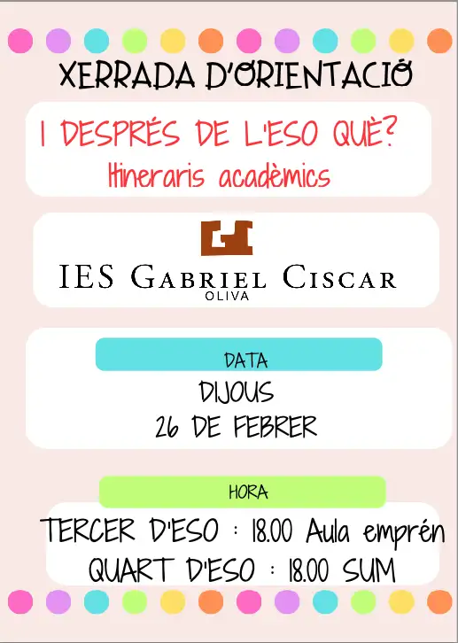 La participació de les famílies és clau en el procés d’orientació acadèmica i personal de l’alumnat. Us convidem a compartir aquest espai de reflexió i informació per a acompanyar conjuntament els vostres fills i filles en la presa de decisions formatives