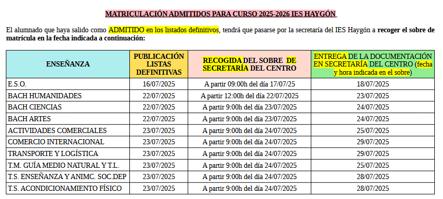 FECHA DE RECOGIDA DE SOBRE Y MATRICULACIÓN DE ADMITIDOS EN EL IES HAYGÓN