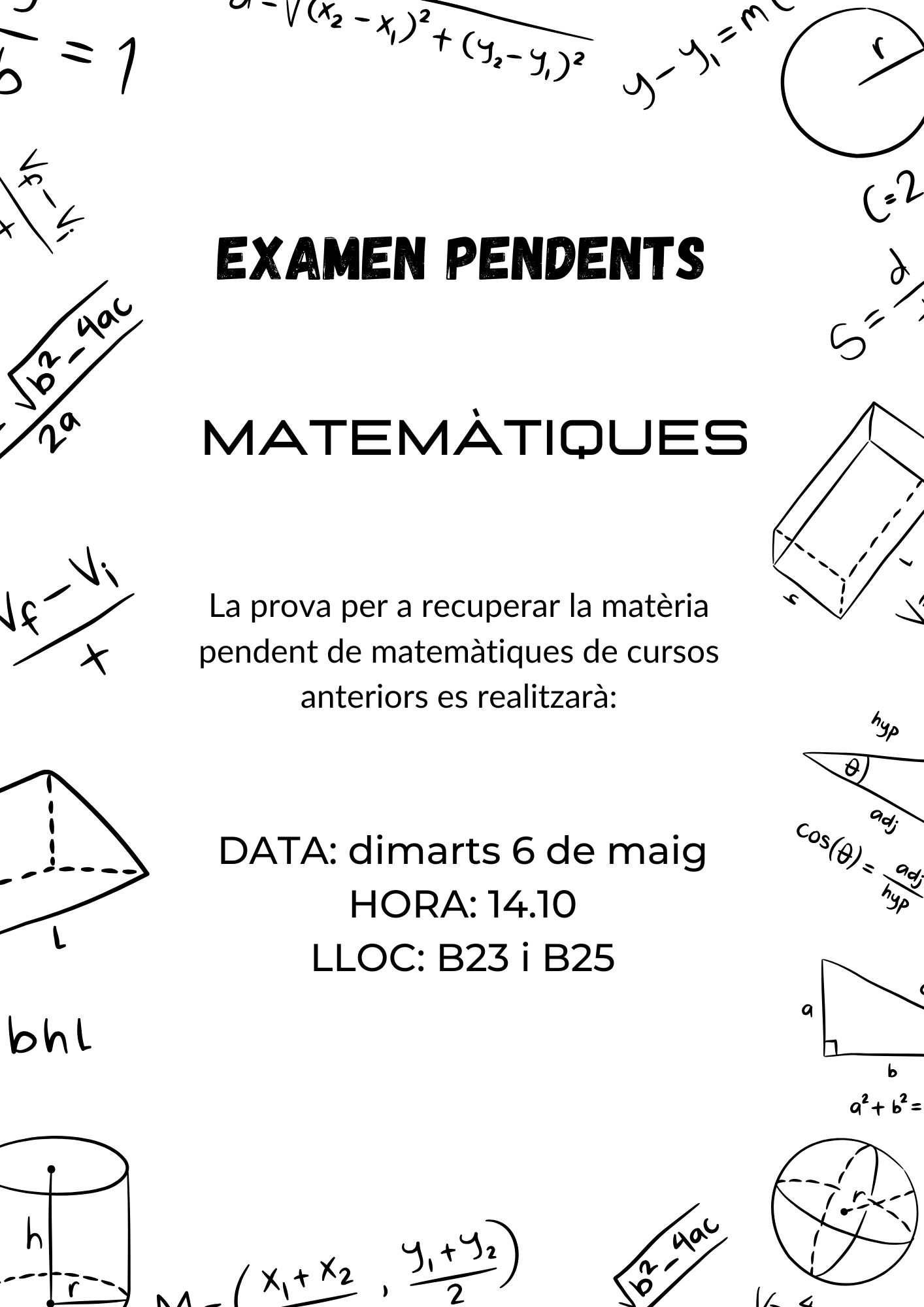 La prueba de la convocatoria extraordinaria para recuperar las pendientes de matemáticas de los cursos anteriores, solo para la etapa de la ESO, se realizará el martes 6 de mayo a las 14.10 a las aulas B23 y B25.