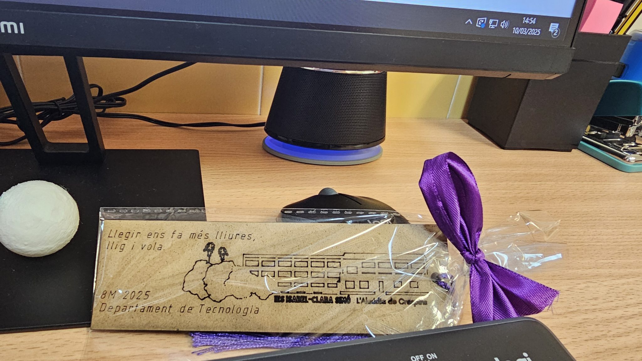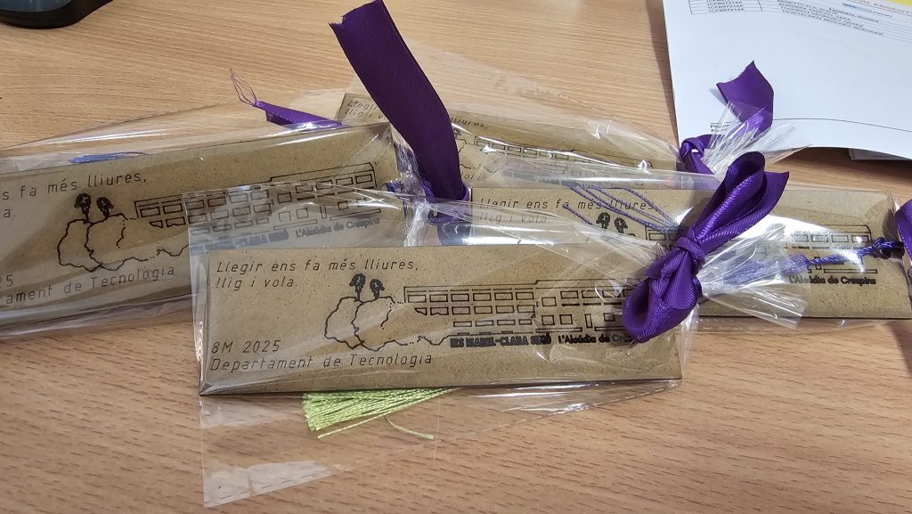 Per a commemorar el 8M, des del Departament de Tecnologia, hem fet uns punts de llibre amb la talladora làser que porten el lema “Llegir ens fa més lliures, llig i vola”.