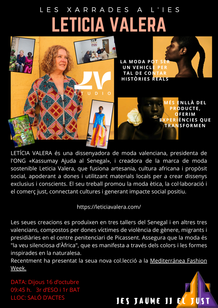 Comencem el cicle de Xerrades a l’IES el pròxim dijous 16 d’octubre al nostre saló d’actes, anmb una molt interessant xarrada a càrrec de Leticia Valera, dissenyadora de moda valenciana, presidenta de l’ONG Kassumay Ajuda al Senegal i creadora de la marca de moda sostenible Leticia Valera que fusiona artesania, cultura africana i propòsit social apoderant a dones i utilitzant materials locals per a crear dissenys exclusius i conscients. El seu treball promou la moda ètica, la col.laboració i el comerç just , connectant cultures i generant impacte social positiu.