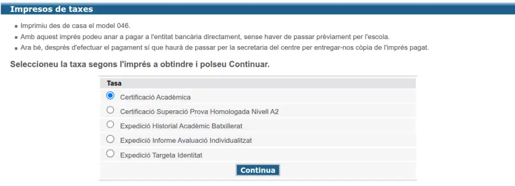 - Accediu al pagament de les taxes mitjançant el model 046 per a l’expedició de títols, i seleccioneu Certificació Acadèmica