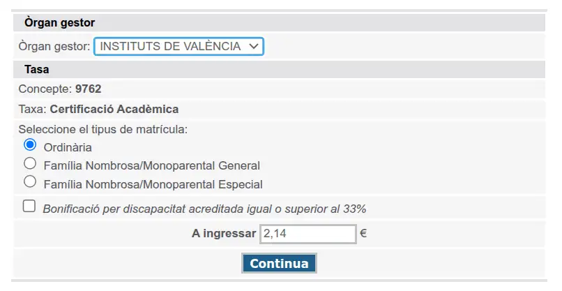 2. Quan continueu, haureu de seleccionar com a òrgan gestor Instituts de València, i el tipus de familia (ordinària o nombrosa), així com si teniu qualsevol bonicifació per discapacitat.