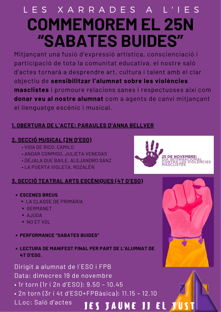 El passat dimecres 19 de novembre al nostre saló d’actes vam celebrar un acte molt especial per tal de commemorar el 25N, el Dia Internacional per l’Erradicació de la Violència Masclista, amb l’actuació de l’alumnat d’arts escèniques de 4t, magistralment dirigit com sempre per la nostra Melanie Puig, així com alumnat de 2n d’ESO. Mitjançant una … Read more