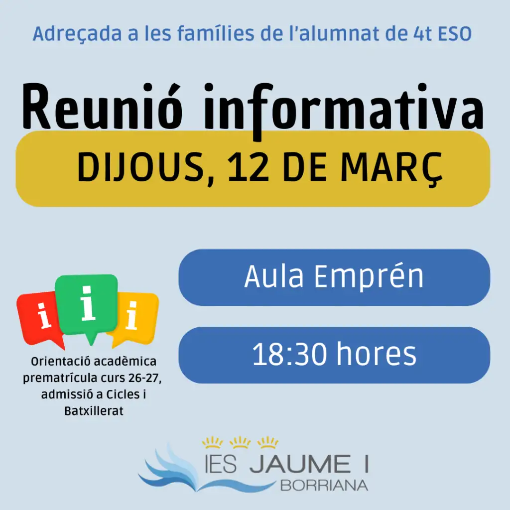 El dijous dia 12 de març tindrà lloc la reunió del departament d’Orientació, adreçada a les famílies de l’alumnat de 4t d’ESO de l’IES Jaume I. A la reunió s’explicaran els processos d’admissió a Cicles i Batxillerat, així com la informació de la prematrícula a Batxillerat del curs 26-27.