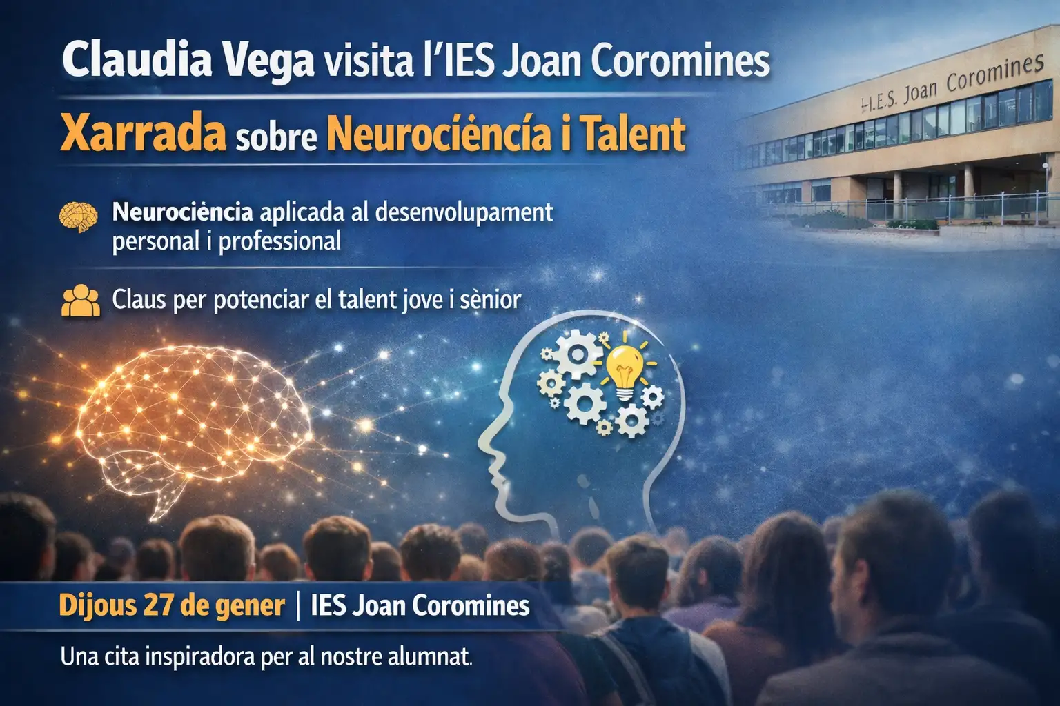 El pròxim 27 de gener, a l’IES Joan Coromines, tindrem l’honor de comptar amb la presència de Claudia Vega, especialitzada en Neurociència i Neuropsicologia, amb més de 25 anys d’experiència com a conferenciant internacional.