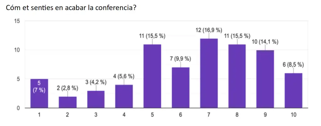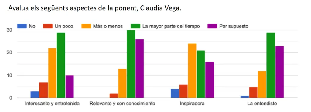 El dia 27 de gener vam tindre l’oportunitat de participar en una xerrada sobre soft skills, impartida per Claudia Vega Ramírez, enginyera especialitzada en Neurociència, Neuropsicologia i Neurocoaching. Durant esta sessió, vam treballar les habilitats toves amb l’objectiu de potenciar el talent del nostre cervell i reforçar la nostra personalitat, reflexionant sobre la seua importància tant en l’àmbit personal com en el professional. Amb la finalitat de conéixer la experiència i continuar millorant este tipus d’activitats, vam convidar a l’alumnat a completar la següent enquesta de satisfacció. Els resultats obtinguts mostren la satisfacció dels assistents.
