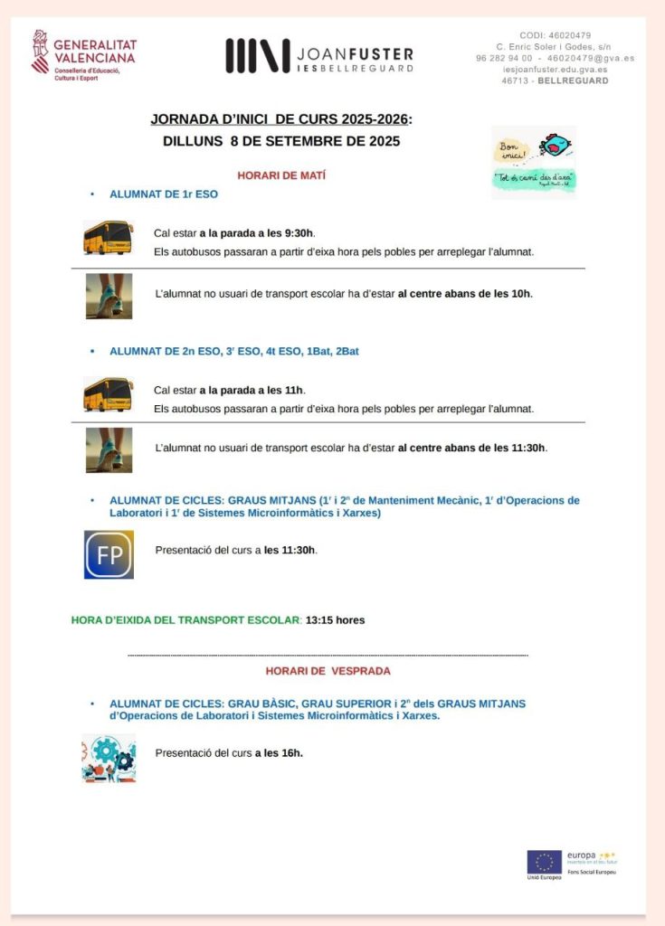 A continuació podeu veure l’horari per a l’inici de curs 2025-2026 per al dilluns 8 de setembre: