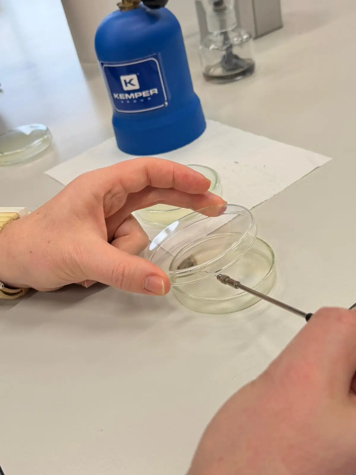 Además, hoy, el Aula Obierta ha seguido con el estudio de los microorganismos. La segunda parte de la práctica que empezamos el día 3, consiste a sembrar o cultivar las bacterias en la placa de Petri. Primeramente, hay que hacer una línea con rotulador permanente en la parte inferior dividiéndola por la mitad y rotulándola con la letra A y B, e identificándola, poniendo nuestro nombre. A continuación abrimos la tapa y presionamos con el dedo en la zona A, tocando ligeramente la superficie de la gelatina y cerramos rápidamente para evitar contaminaciones. Después de lavarnos las manos con jabón repetimos la misma operación en la zona B. Finalmente introducimos la placa de Petri en la estufa a 37 °C durante 72 horas. (El medio de cultivo en placa se puede sustituir por pan de molde que metemos dentro de bolsas de plástico para incubar los microorganismos.) Los microbiólogos suelen trabajar en un entorno estéril alrededor de una llama de un mechero Bunsen que crea una corriente ascendente de aire caliente. También usan un asa de siembra para transferir microorganismos de una placa a otra, que consta de un mango que lleva un filamento que se puede esterilizar a la llama