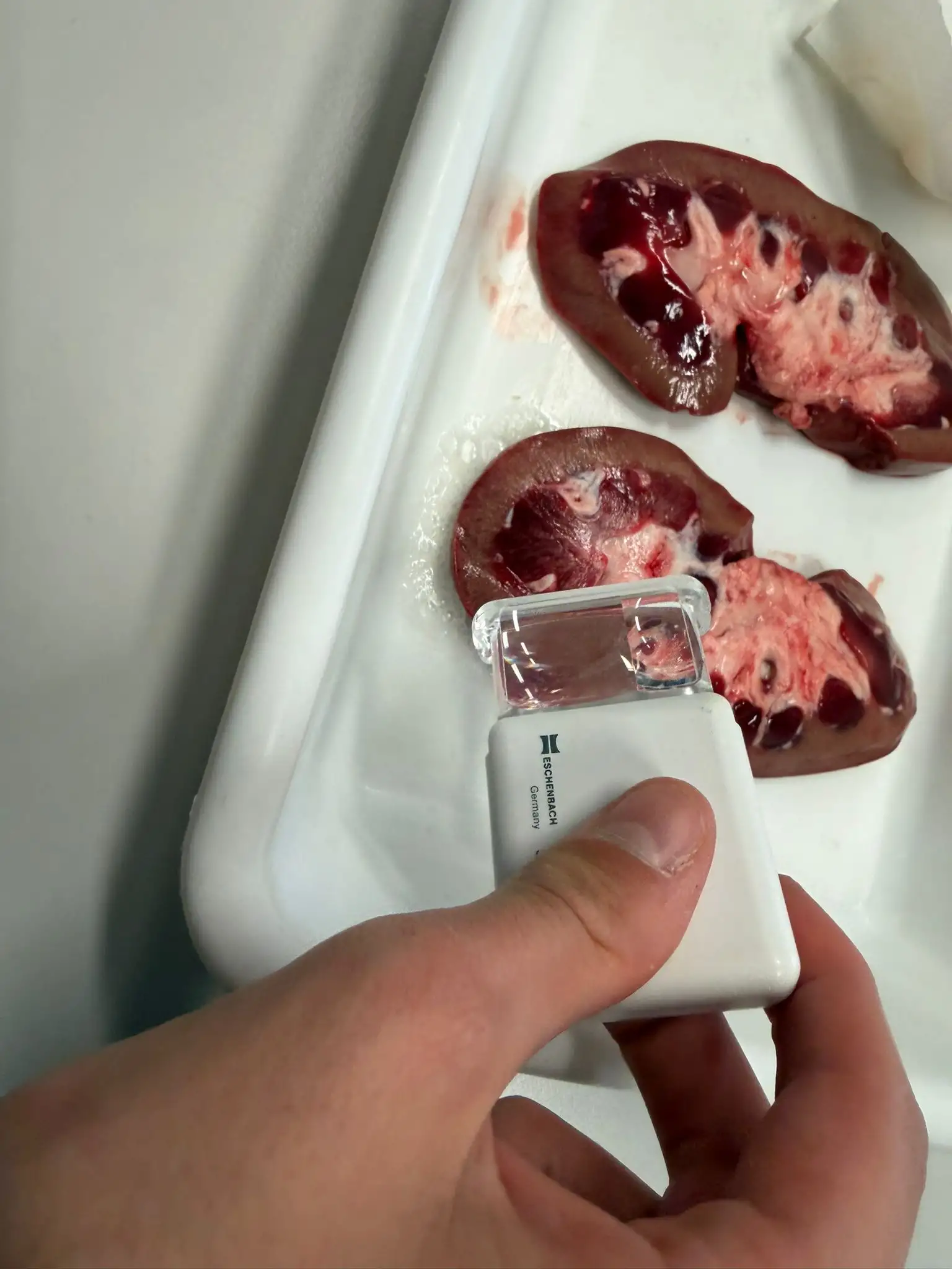 En la segunda parte de la clase, para continuar la investigación de la anatomía humana aprovechamos la disección de un riñón para estudiar la estructura y funcionamiento del aparato excretor urinario. El riñón es un órgano en forma de judía la función del cual es formar y excretar la orina que contiene las sustancias de deshecho del metabolismo celular transportadas por la sangre. En este caso usamos un riñón de cerdo de unos 10-12 cm, muy parecido al nuestro que previamente hemos cortado de forma longitudinal dejándolo abierto como un libro. La parte cóncava o hileo presenta un surco de entrada de las arterias y venas renales así como el uréter, conducto de expulsión de la orina hacia la vejiga. Desgraciadamente, no conserva la glándula suprarrenal productora de adrenalina pero, podemos distinguir externamente la cápsula que recubre su superficie, que es de color marrón cobrizo. Internamente, diferenciamos tres partes de fuera para adentro: corteza, médula y pelvis renal.
