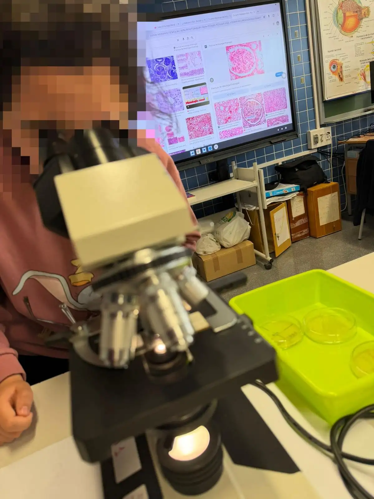 Hoy, el Aula Oberta con los/las compañeros y compañeras de 3º de ESO, han hecho la tercera parte de la práctica sobre el estudio de los microorganismos, que consiste a hacer un análisis de los resultados. Previamente, cada alumno planteó su hipótesis de en qué parte de la placa encontrará más microorganismos, para contrastarla posteriormente (confirmación o rechazo de la hipótesis).