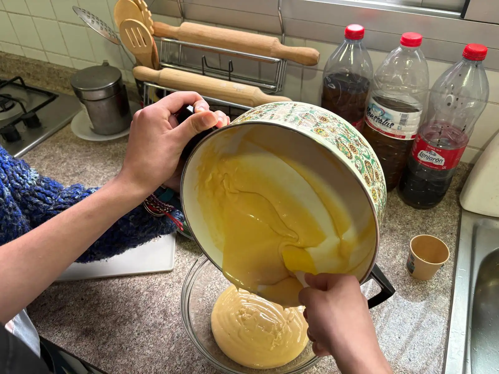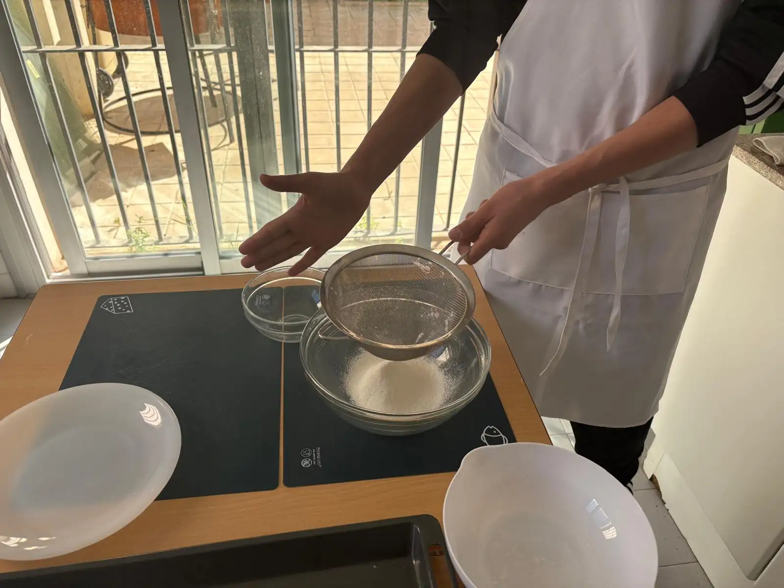 La actividad empieza con el pesaje de los ingredientes, un paso fundamental puesto que la repostería es una disciplina extremadamente precisa donde cualquier pequeña variación altera el resultado final: se pesan 120g de harina, 250ml de agua y 20g de mantequilla.