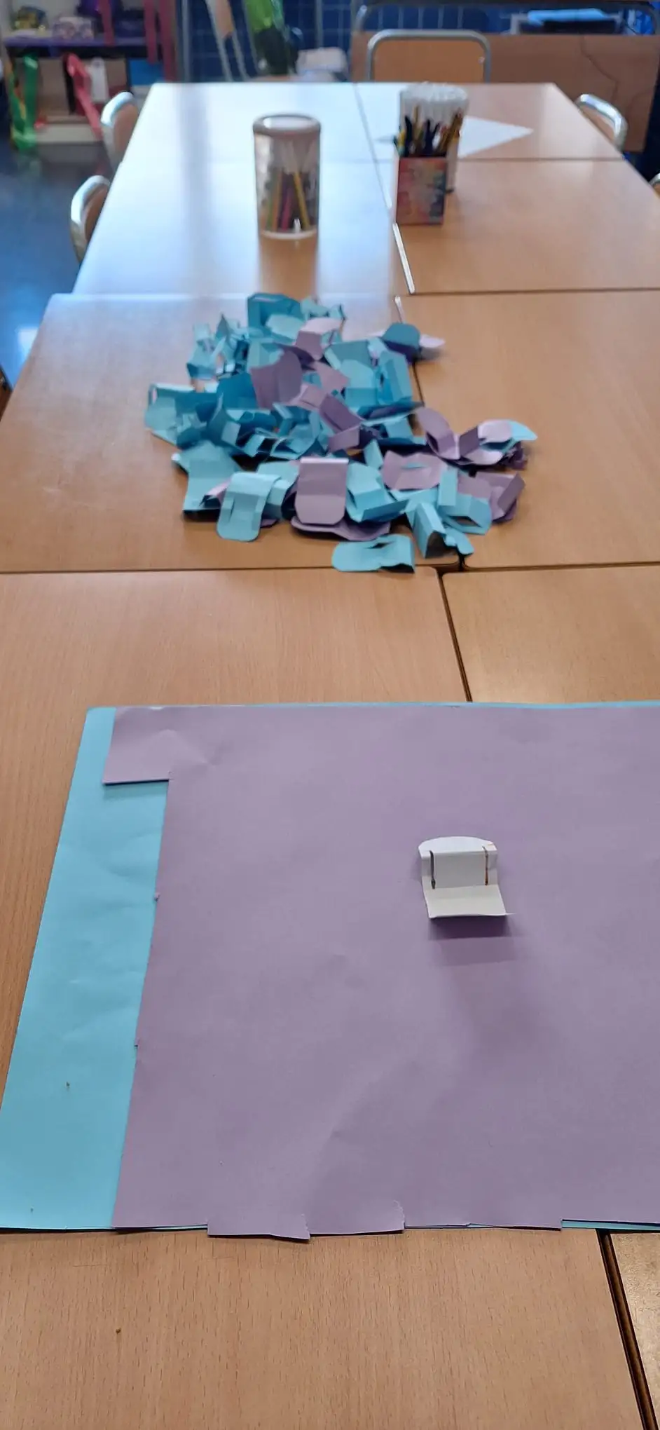 Hoy en el Punt Violeta, se ha seguido jugando al Cli-sex y se han seguido cortando sillitas de cartulina azules y moradas. Como ya explicamos en febrero, que fue cuando empezaremos con esta iniciativa, el debate se centra en la baja representación femenina en las esferas de poder. Para materializar esta idea, el grupo decidió crear una gran instalación de «sillitas de cartón» que representan los gobiernos del mundo. Como ya explicamos, se estableció uno el código de colores: las sillas de color azul para países con líderes masculinos (presidentes o primeros ministros) y las de color morado para aquellos estados gobernados por mujeres. Por ahora seguimos recortando sillitas a la espera de tenerlas todas y pasar al montaje