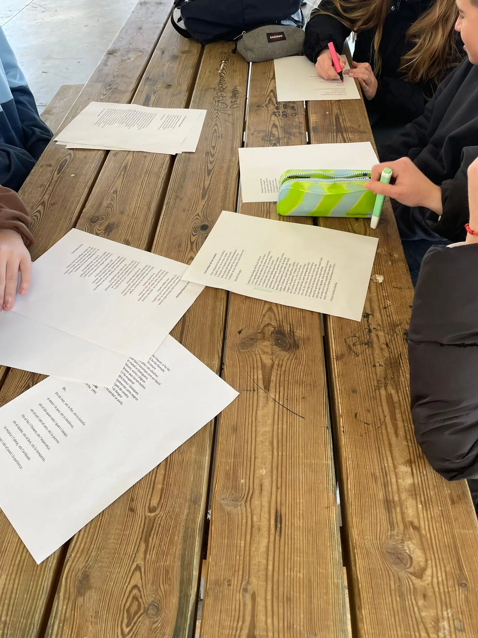 La hora del patio de hoy tiene un ritmo diferente. En la zona Pigmalió, el espacio delimitado con sus mesas se convierte en el epicentro de una actividad creativa. El alumnado del programa no está solo por almuerzo o charlar; hoy las mesas están cubiertas de libros, libretas y hojas sueltas, donde todas las parejas se juntan con un objetivo claro: preparar los poemas para el próximo recital. Alrededor de las mesas, los tutores y tutoras guían sus tutorand@s en la elección de los textos trabajando la lectura comprensiva y la entonación. Los más mayores explican el significado de las metáforas a los más pequeños, mientras estos ensayan como proyectar la voz para perder el miedo escénico