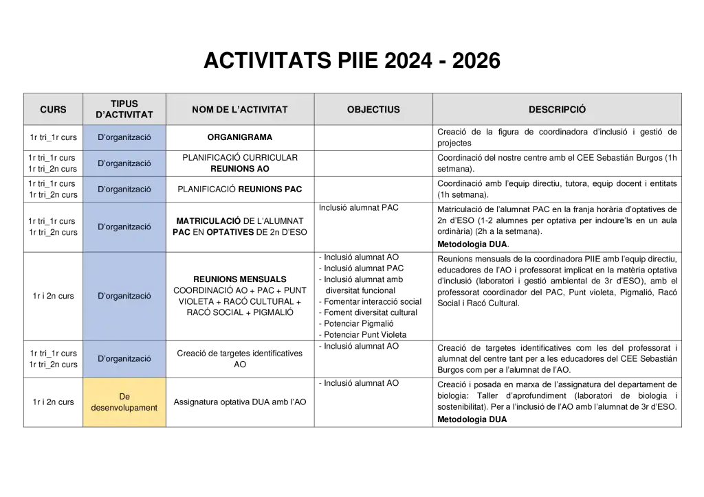 CRONOGRAMA ACTIVITATS PIIE 2024