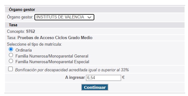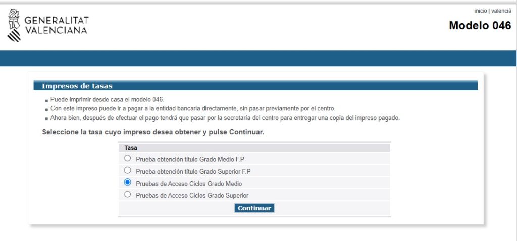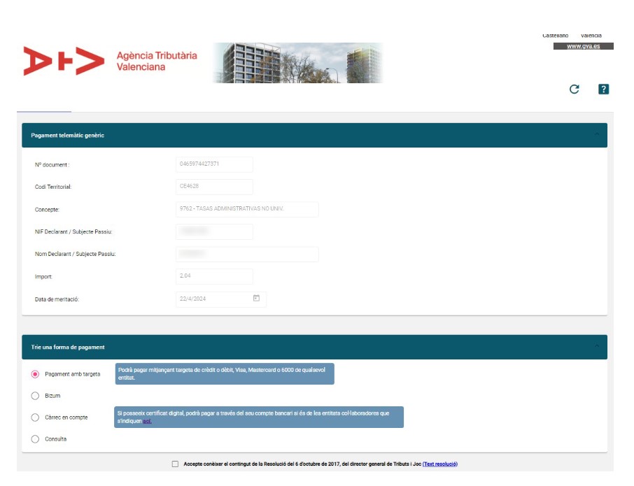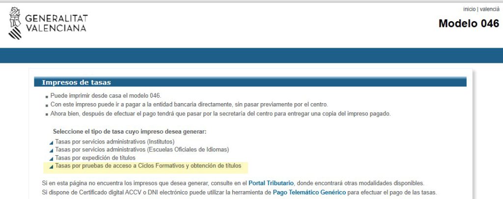 El siguiente enlace le da acceso a la página oficial de la Generalitat Valenciana para el pago de tasas oficiales:
