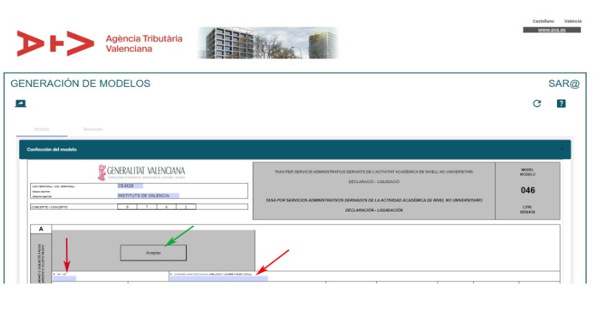 En la página “CONFECCIÓN DE MODELOS” de la Agència Tributària Valenciana aparece el documento 046.