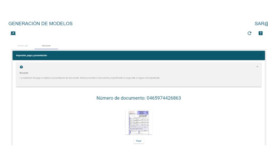 Tras seleccionar “Cerrar” aparece la ventana con n.º de documento y la opción “Pagar”.
