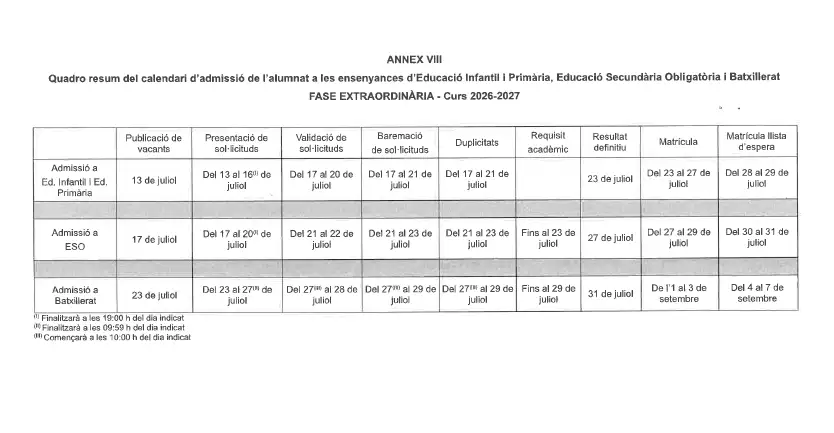 CALENDARI D’ADMISSIÓ ESO – BATXILLERAT 2026-2027