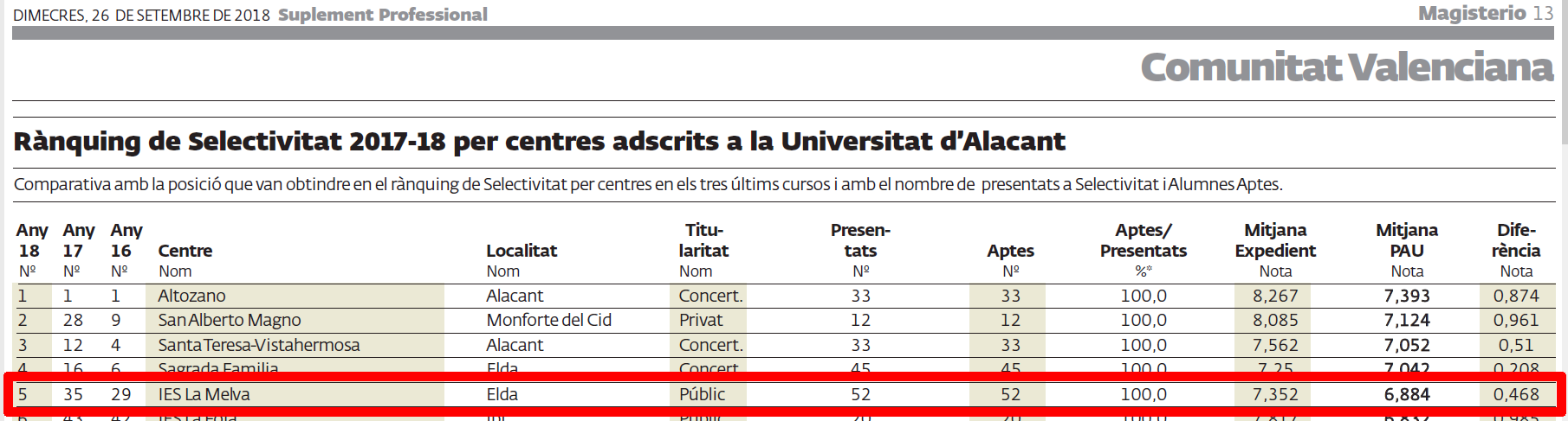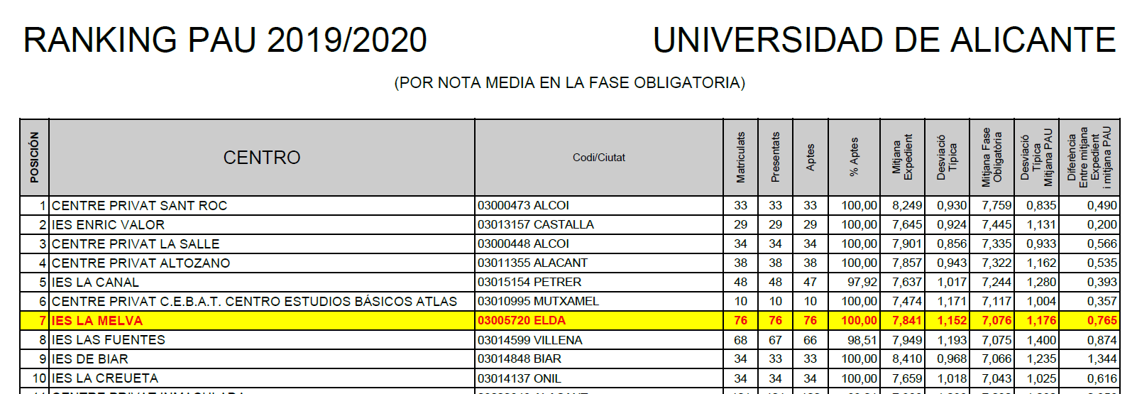 EL IES LA MELVA FUE EN 2018 EL MEJOR CENTRO PÚBLICO DE LA UNIVERSIDAD DE ALICANTE EN SELECTIVIDAD