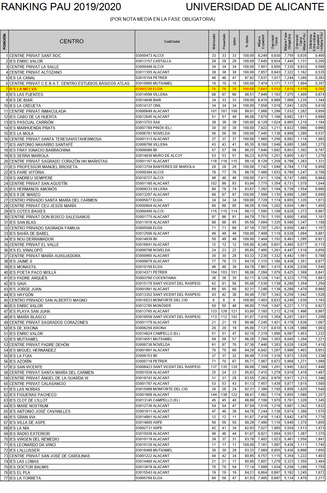 Este ránking se establece por la nota media obtenida por el alumnado de cada centro en la fase obligatoria de la PAU, o sea, se establece con las calificaciónes medias obtenidas en las materias comunes (Historia de España, Lengua Castellana, primer idioma y Valenciano) más la materia obligatoria de la modalidad que ha cursado cada alumno (Matemáticas aplicadas a las Ciencias Sociales II, Latín o Matemáticas II). En este caso se han presentado un total de 74 alumnos a la fase general de la prueba, resultando aprobados todos ellos y obteniendo una nota media de 7,1161 sobre 10. La calificación media del expediente de dicho alumnado fue de 7,857 por lo que la desviación entre ambos promedios ha sido solo de 0,74 puntos.