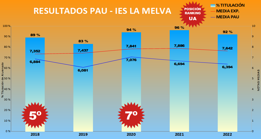 Los resultados del alumnado del IES La Melva en la PAU se evidencian en los datos que publica la Universidad de Alicante de sus casi 80 centros adscritos -públicos y privados-, situándose cuatro veces en los últimos 12 años entre los mejores centros del ranking: 2011 (3º), 2012 (5º), 2018 (5º) y 2020 (7º)