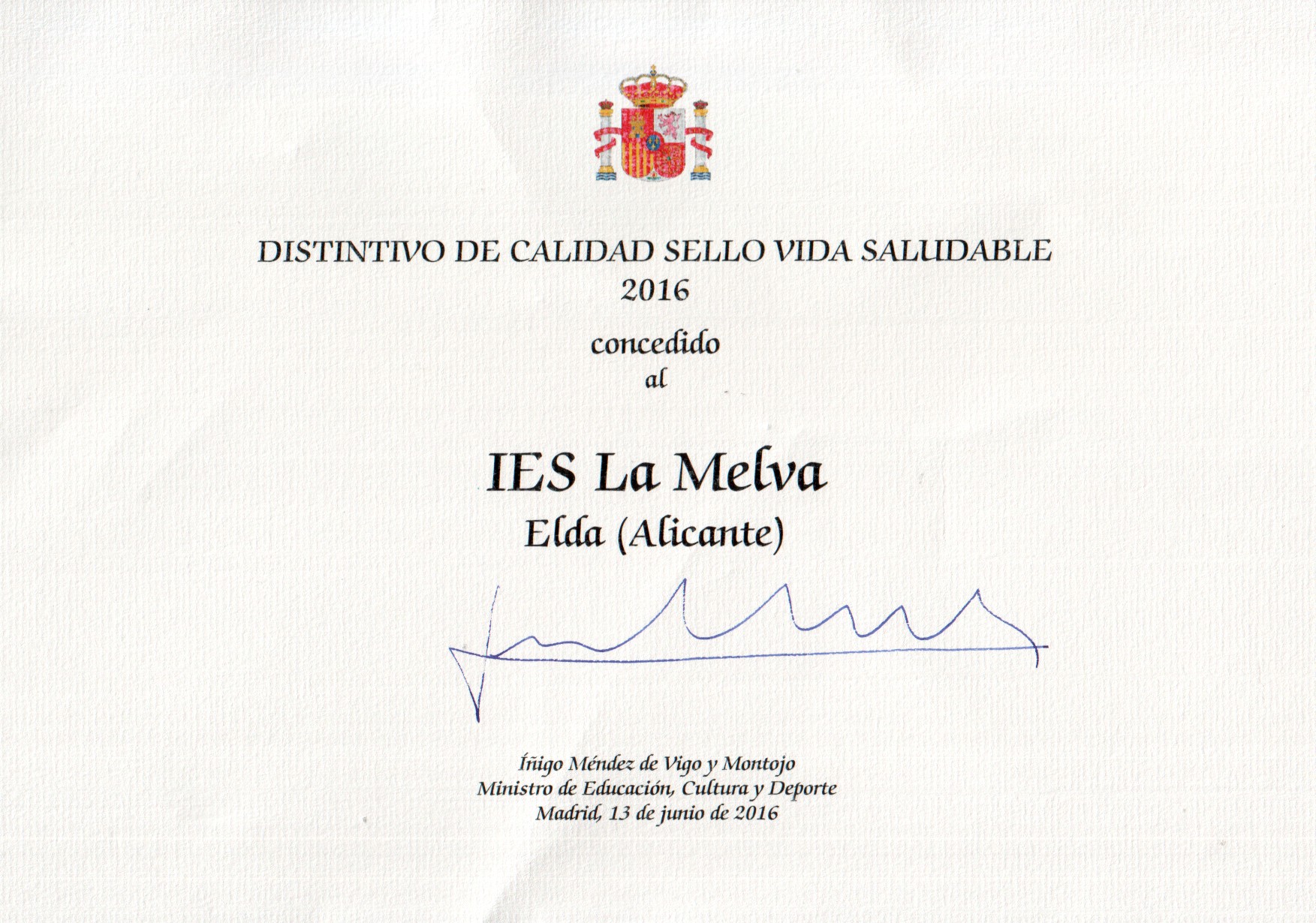 El IES La Melva ha logrado este distintivo que ha concedido por primera vez el Ministerio de Educación para reconocer a los centros educativos que han demostrado en una memoria técnica que en los últimos 10 años han fomentado el aprendizaje de la salud en el ámbito educativo, la asunción de prácticas de vida saludable y una actividad física que permita el adecuado desarrollo personal y social de los alumnos. Lo han solicitado más de 300 centros de toda España y lo han logrado solo 73 centros, 5 de ellos de Alicante, siendo el IES La Melva el único instituto de secundaria de la Comunidad Valenciana que ha recibido este distintivo de calidad.