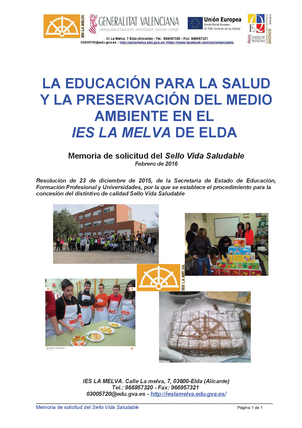 PRIMER INSTITUTO DE SECUNDARIA DE LA COMUNIDAD VALENCIANA QUE OBTIENE EL SELLO VIDA SALUDABLE