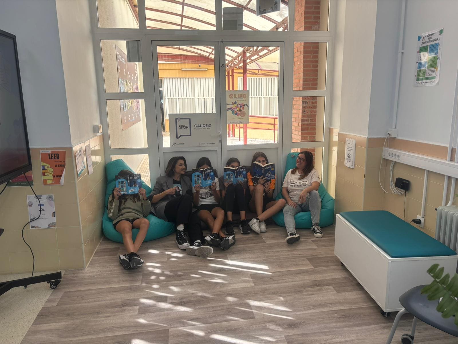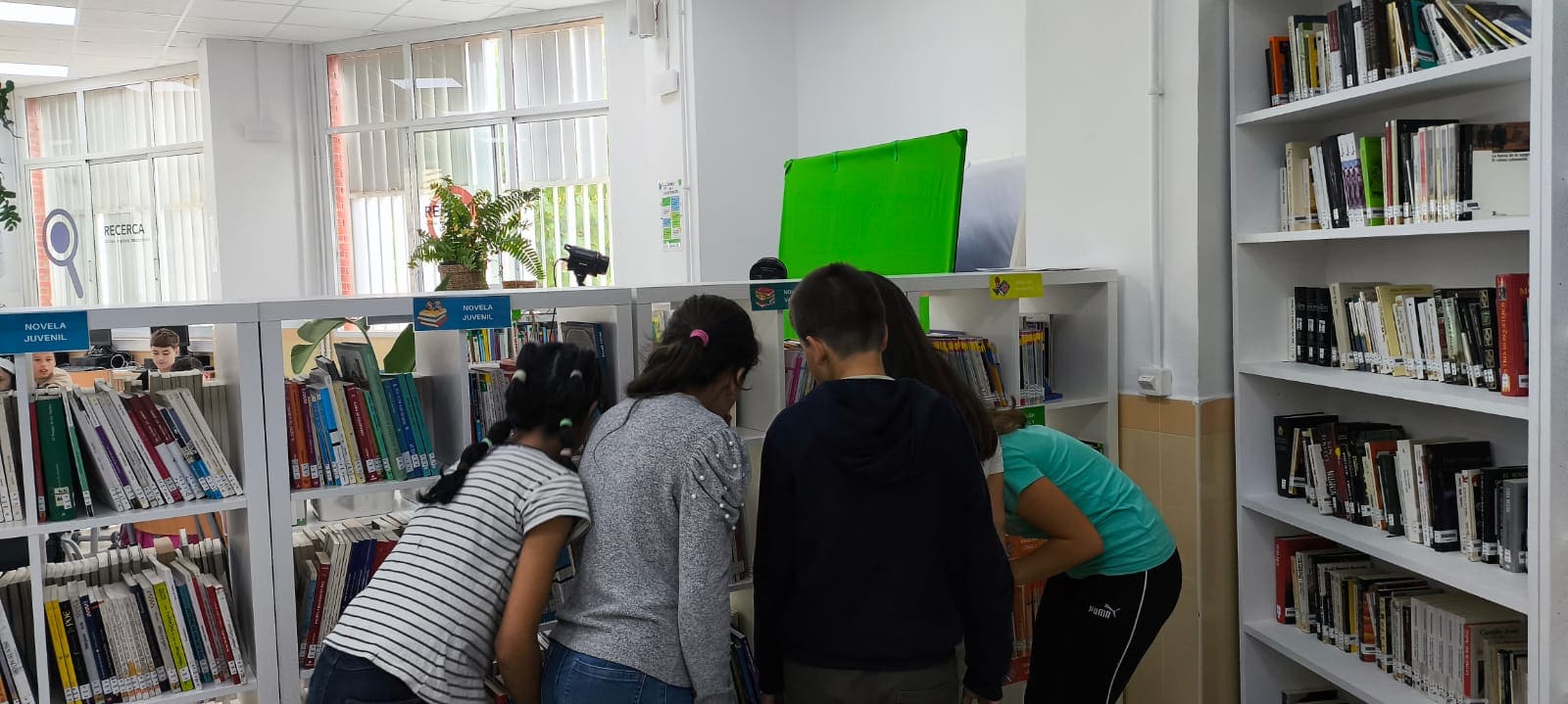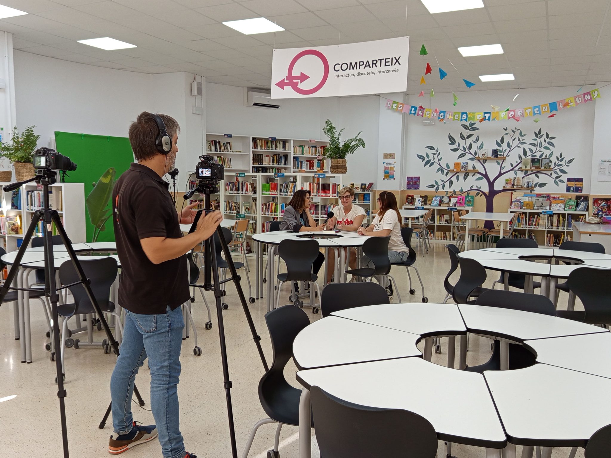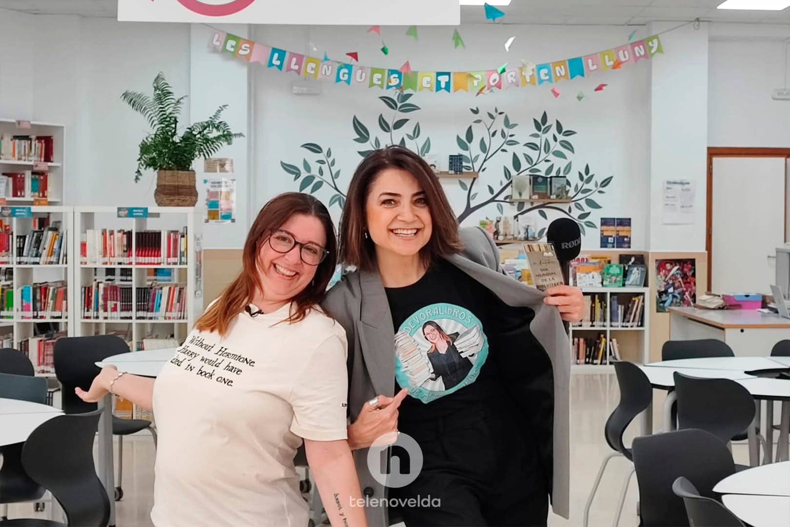 Recibimos también la visita de Tele Novelda para grabar en nuestra biblioteca la sección de literatura «Devoralibros de metro y medio» del programa A poqueta nit, con Maje Amorós e Inés F. López. Este programa especial contó con la presencia de unas invitadas estelares, nuestras chicas del Club de Lectura de La Mola, dirigido por el profesor Abraham Marco.