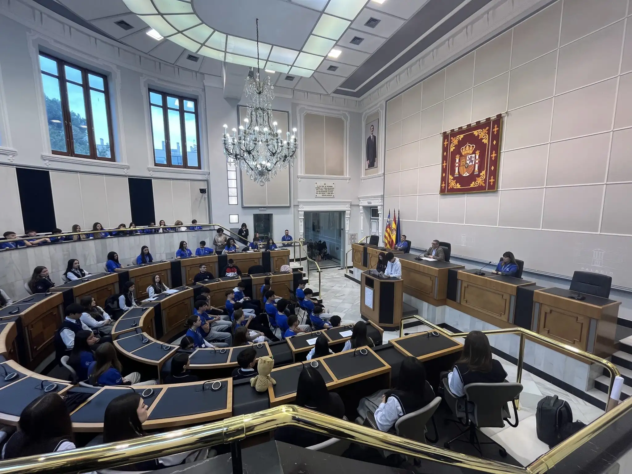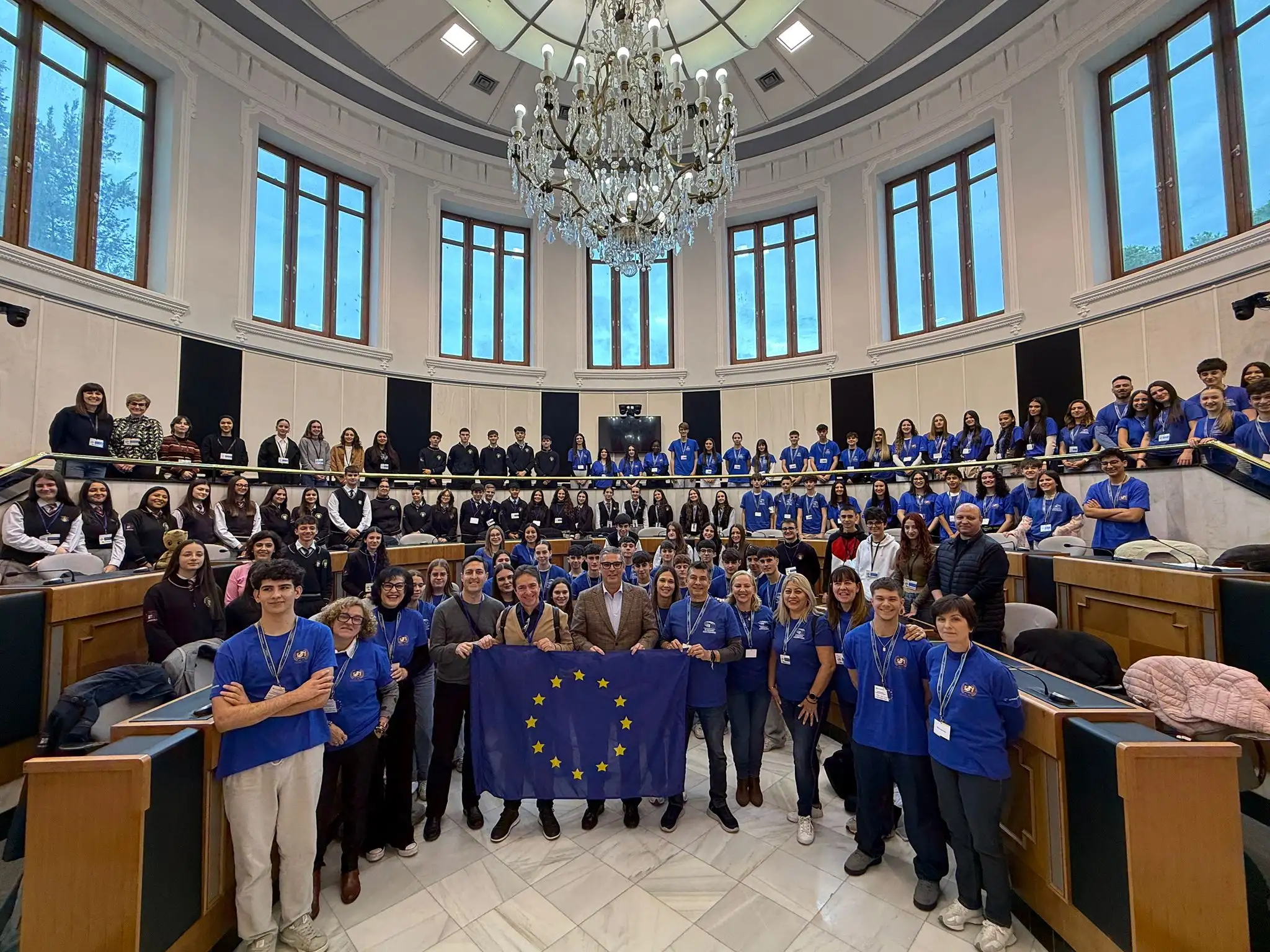 Nuestras Embajadoras y Embajadores Júnior, acompañados/as por sus profesoras, han tenido voz en la recepción a la que han sido acogidos por D. José Antonio Bermejo Castelló, diputado provincial de Bienestar de las Personas. El Sr. Bermejo ha tenido unas palabras de reconocimiento a los/as Embajadores/as Junior de los seis centros educativos alicantinos que forman parte este curso del programa EPAS: IES La Mola (Novelda), IES Sixto Marco (Elche), Colegio Diocesano Oratorio Festivo de San Miguel (Orihuela), Colegio Diocesano San Juan Bautista (Alicante) IES Gabriel Miró (Orihuela) y el IES Severo Ochoa (Elche). Cada centro ha tenido unos minutos el turno de palabra para exponer cuestiones de democracia y participación ciudadana que preocupan a los/las jóvenes de nuestros centros en la sala de plenos de la Diputación Provincial de Alicante. El tema principal: La consolidación de Europa como garantía de libertad y derechos en el 40 Aniversario de la incorporación de España a la UE (1986-2026).