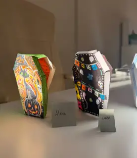 L’activitat, titulada “Mini-històries de terror”, va començar amb un repte gens habitual: decorar, pintar i muntar un taüt. Amb molta imaginació (i algun esglai), les alumnes van redactar la seua pròpia història de por, i que posteriorment van gravar en RadioMola. Però el projecte no va acabar ací: van aprendre a usar Audacity, una ferramenta d’edició d’àudio amb la qual van afegir efectes sonors i música inquietant. Portes que cruixen, passos misteriosos, riures esgarrifosos… no va faltar de res! El resultat final va ser espectacular i, com mereixia l’ocasió, tots els taüts es van exposar en BiblioMola.