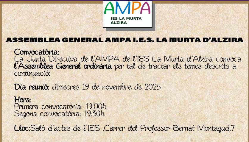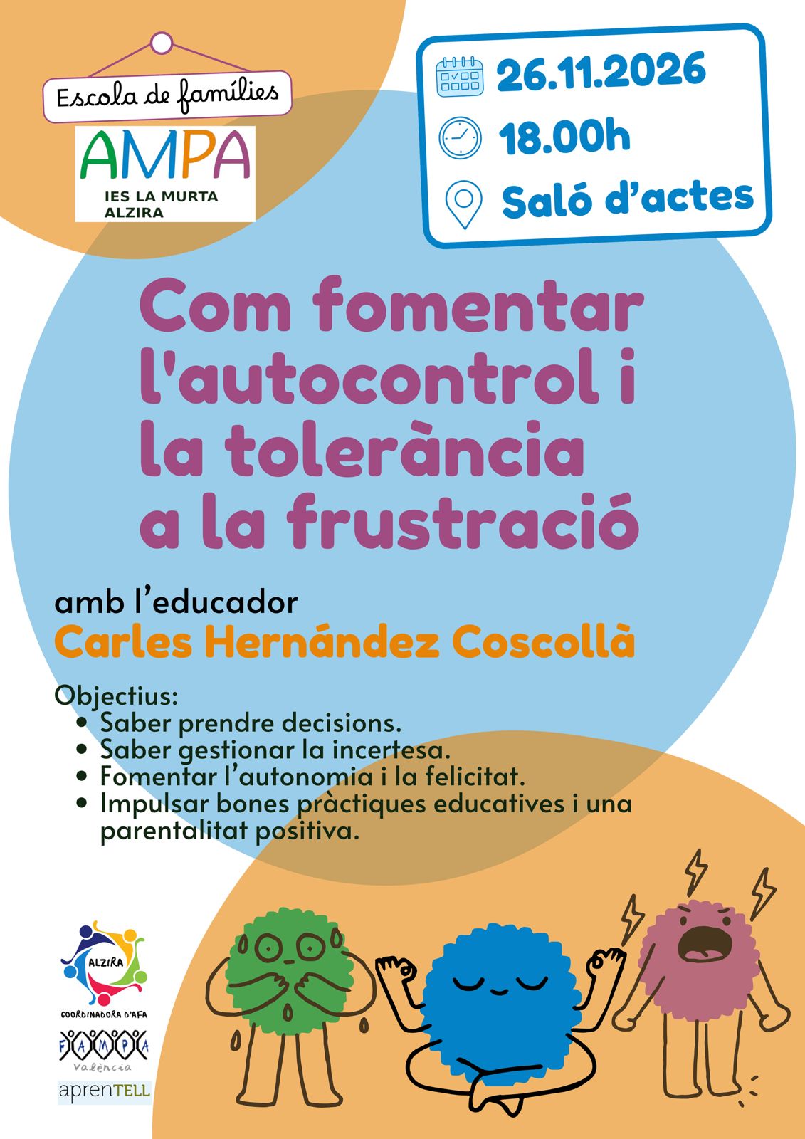 Famílies, comencem!El pròxim dimecres 26 de novembre celebrarem la primera sessió de l’Escola de Famílies del curs 25-26. Parlarem sobre l’autocontrol i la tolerància a la frustració, amb la guia de l’educador Carles Hernández Coscollà, amb la col·laboració de FAMPA-València i de la Coordinadora d’AFA d’Alzira. 📅 Data: 26 de novembre de 2026📍 Lloc: Saló d’Actes de l’IES La … Llegir més