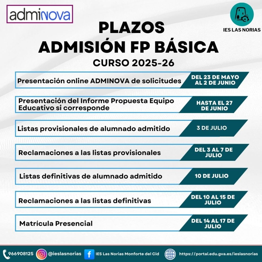 🔷Del 23 de mayo al 2 de junio está abierto el plazo para presentar la solicitud de admisión a los ciclos formativos de grado básico, medio y superior para el curso 2025-2026.