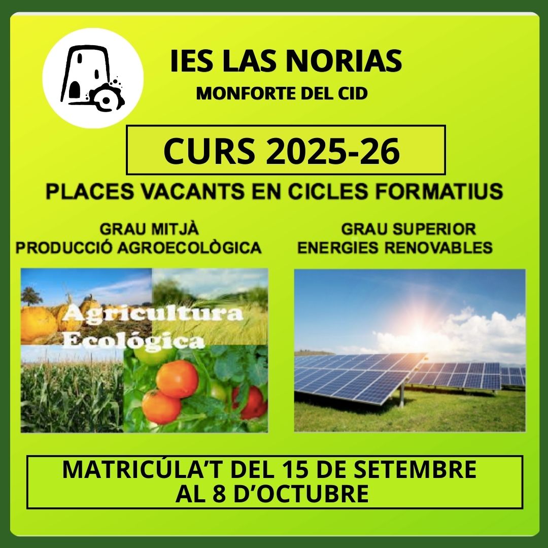 🔸L’IES “Las Norias” disposa de places vacants en els cicles formatius de grau mitjà de Producció Agroecològica i Superior d’Energies Renovables.