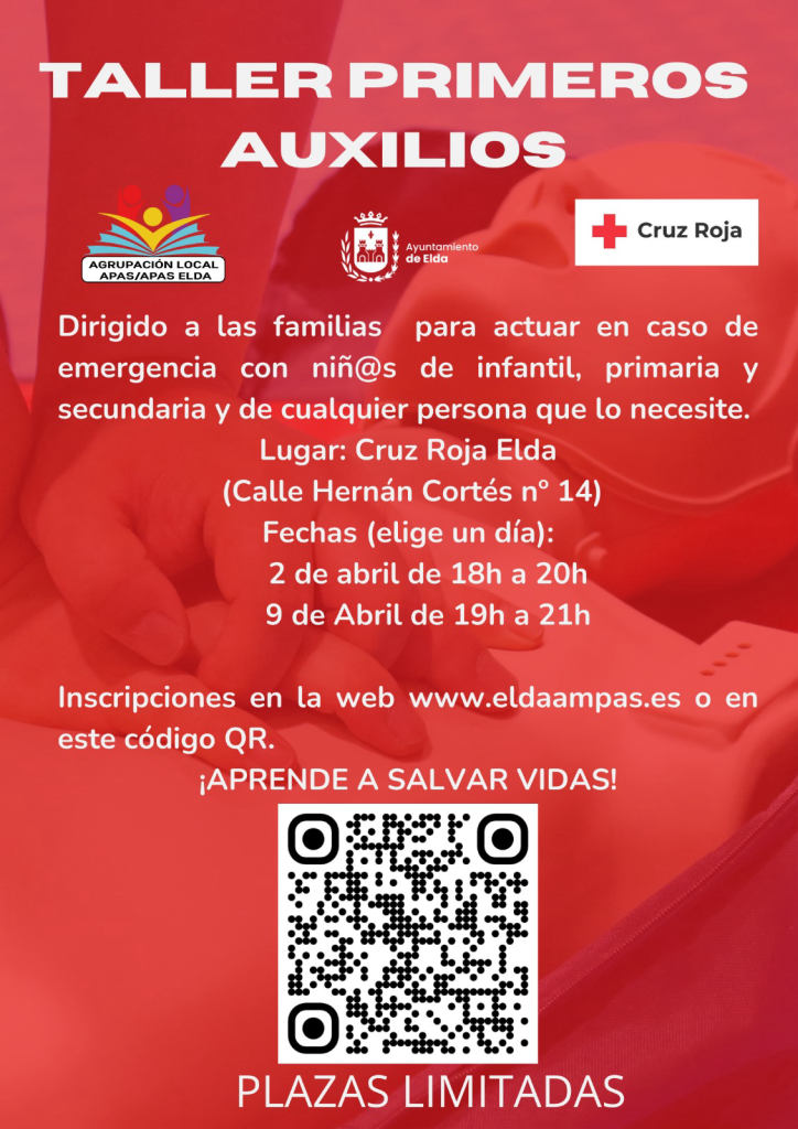 Un año más, la agrupación de APAS de Elda en colaboración con la Cruz Roja, ofrece este interesante taller de primeros auxilios. Las plazas son limitadas. Toda la información en el QR de la imagen.